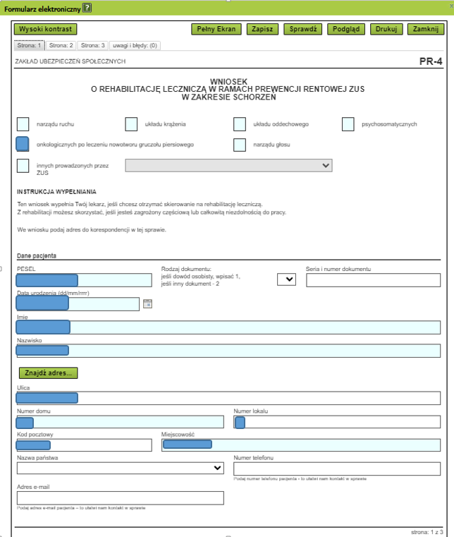 Wniosek o rehabilitację możesz wypełnić korzystając z interaktywnego druku PR-4, dostępnego na stronach internetowych ZUS, lub wydrukować formularz i wypełnić go odręcznie. Pamiętaj, aby wpisać: