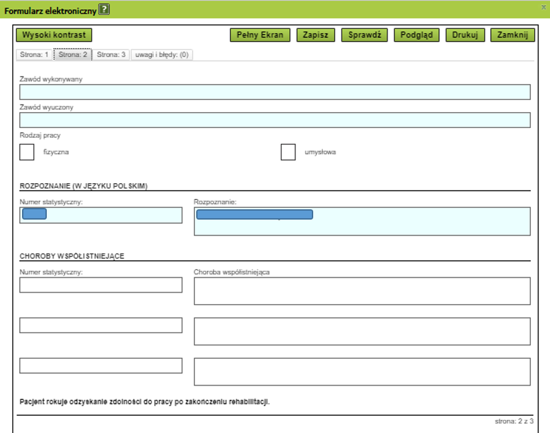 Na kolejnych stronach wybierz zawód i rodzaj pracy pacjenta oraz jego choroby współistniejące