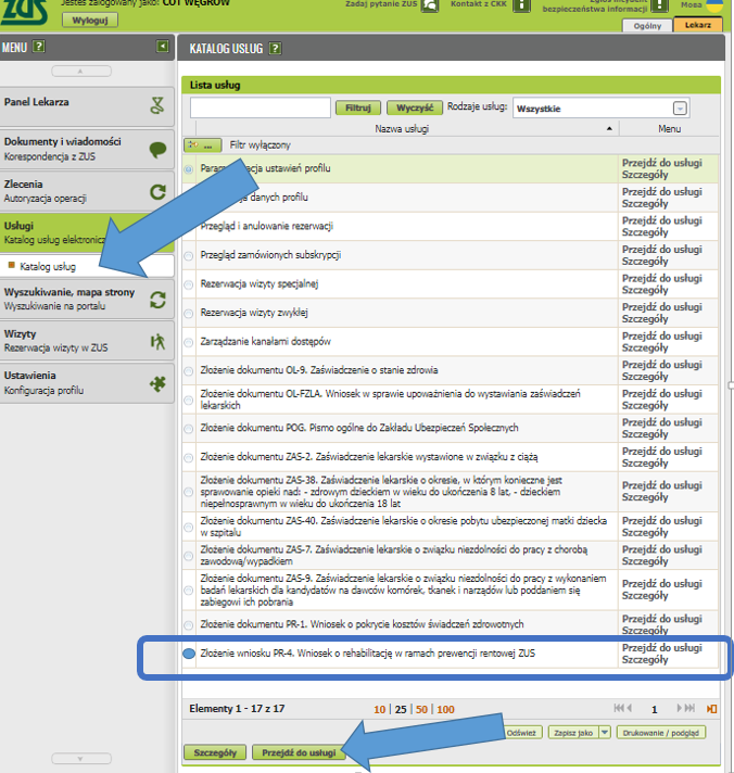 Wybierz z dostępnych zakładek Wnioski, a następnie z dostępnych wniosków – PR-4